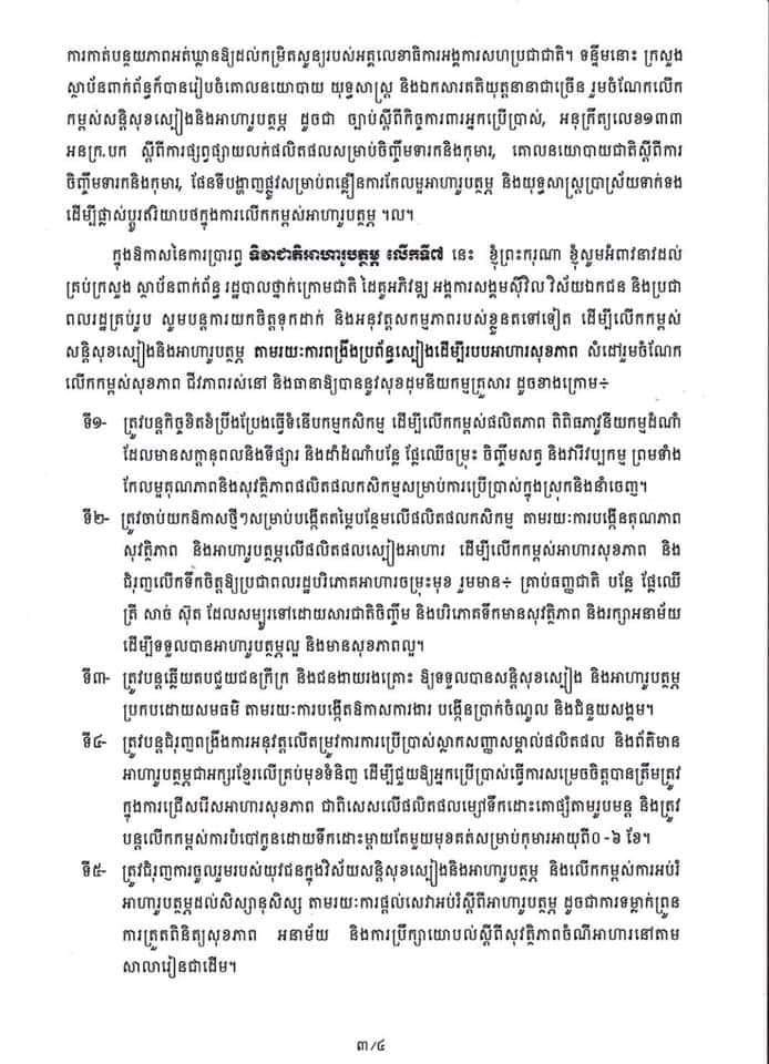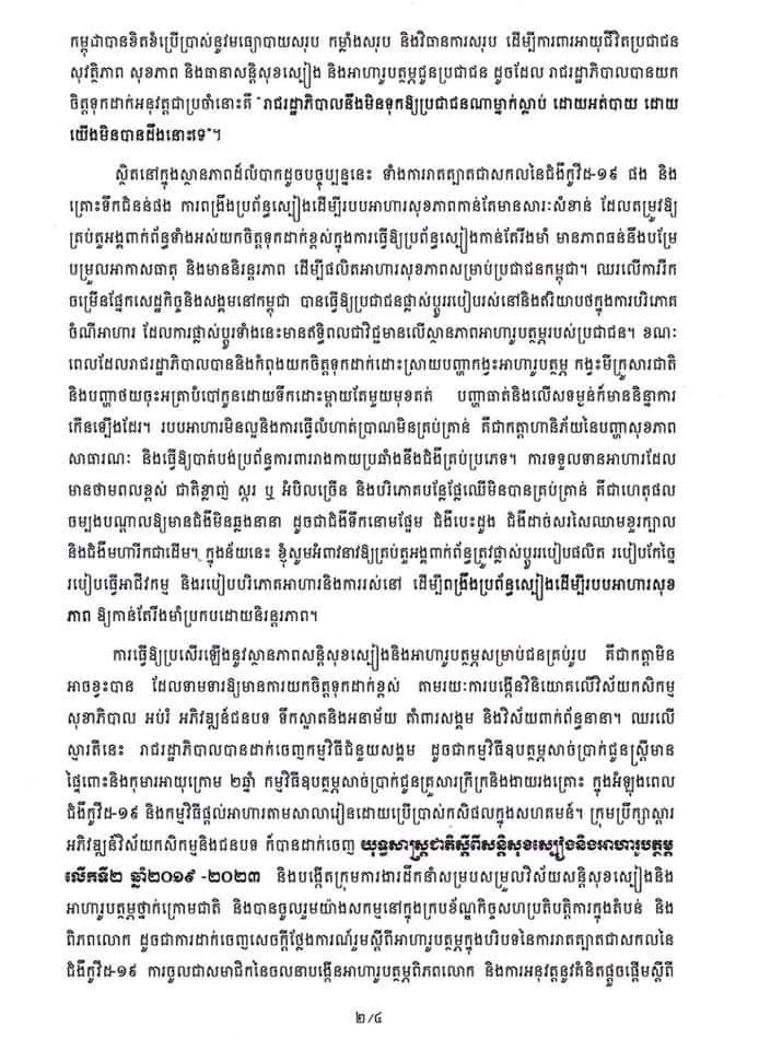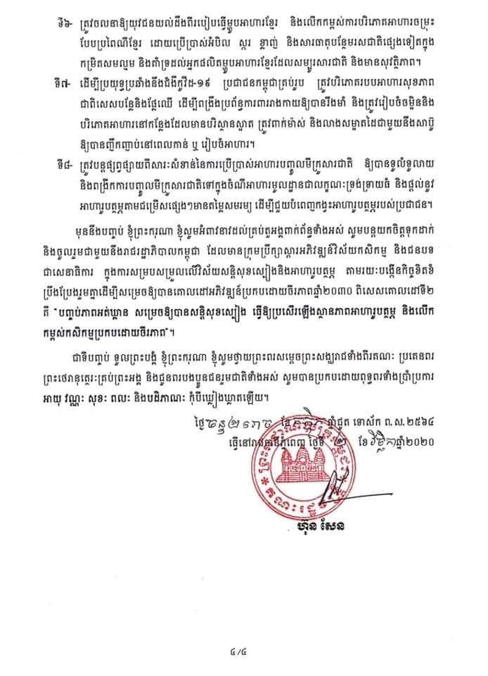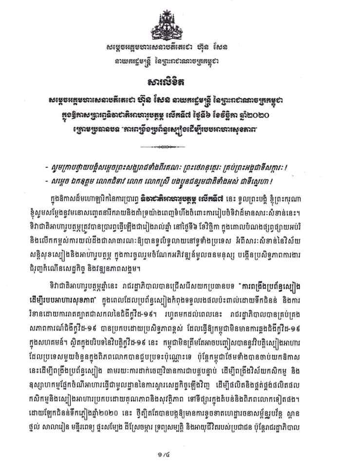 សម្ដេចអគ្គមហាសេនាបតីតេជោ ហ៊ុន សែន នាយករដ្ឋមន្ត្រីនៃព្រះរាជាណាចក្រកម្ពុជា ផ្ញើសារលិខិតអបអរសាទរ ក្នុងឱកាសប្រារព្ធ ទិវាជាតិអាហារូបត្ថម្ភ លើកទី៧ ថ្ងៃទី០៦ ខែវិច្ឆិកា ឆ្នាំ២០២០ ក្រោមប្រធានបទ «ការពង្រឹងប្រព័ន្ធស្បៀង ដើម្បីរបបអាហារសុខភាព»។