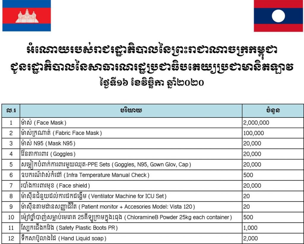 ប្រមុខរាជរដ្ឋាភិបាល សម្តេចតេជោ ហ៊ុន សែន បានចាត់តាំងសម្តេចពិជ័យសេនា ទៀ បាញ់ ឧបនាយករដ្ឋមន្រ្តី រដ្ឋមន្រ្តីក្រសួងការពារជាតិ ជាតំណាង ដើម្បីដឹកនាំគណៈប្រតិភូនាំយកអំណោយម៉ាសចំនួន២លាន និងបរិក្ខារពេទ្យទាំងនេះយកទៅជូនរដ្ឋាភិបាល និងប្រជាជនឡាវ នៅព្រឹកថ្ងៃចន្ទ ទី១៦ ខែវិច្ឆិកា ឆ្នាំ២០២០។