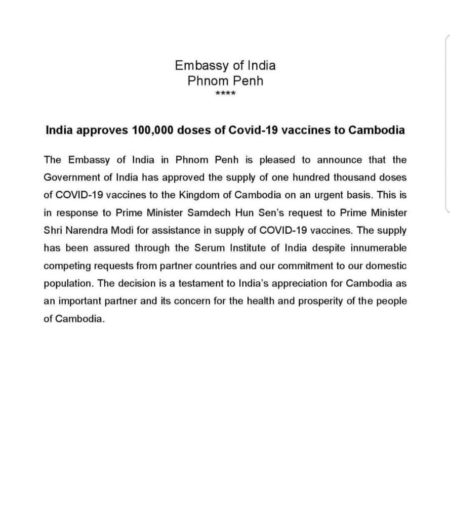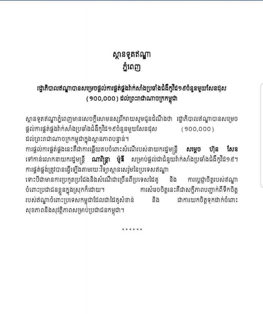 សេចក្តីប្រកាសរបស់ស្ថានទូតឥណ្ឌា បានជូនដំណឹងថា រដ្ឋាភិបាលឥណ្ឌាបានសម្រេច ផ្តល់ការផ្គត់ផ្គងវ៉ាក់សាំងប្រឆាំងជំងឺកូវីដ១៩ចំនួនមួយសែនដូស (១០០,០០០) ដល់ព្រះរាជាណាចក្រកម្ពុជា ក្នុងស្ថានភាពបន្ទាន់។ ការផ្តល់ការផ្គត់ផ្គងនេះ គឺជាការឆ្លើយតបចំពោះសំណើរបស់នាយករដ្ឋមន្រ្តី សម្តេច ហ៊ុន សែន ទៅកាន់លោកនាយករដ្ឋមន្រ្តី ណារិន្ត្រា ម៉ូឌី សម្រាប់ផ្តល់ជាជំនួយវ៉ាក់សាំងប្រឆាំងជំងឺកូវិដ១៩។