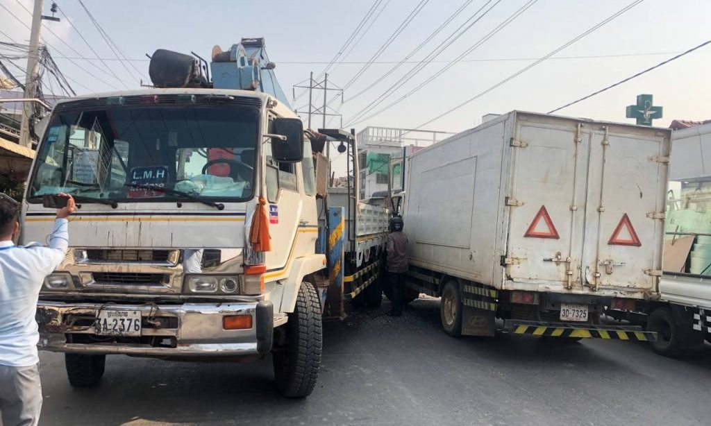 ភ្នំពេញ ៖ រថយន្តឃ្លុបដឹកទំនិញមួយគ្រឿងបានទៅបុកជាមួយរថយន្តស្ទូចដែលកំពុងបើកឆ្លងកាត់ទទឹងផ្លូវបណ្ដាលឲ្យគាបជាប់តៃកុងម្នាក់តែគ្រាន់តែរងរបួសស្រាលប៉ុណ្ណោះ និងធ្វើឲ្យរថយន្តទាំងសងខាងរងការខូចខាត បង្កឲ្យមានការកកស្ទះចរាចរណ៍ដល់អ្នកដំណើរ កាលពីវេលាម៉ោង៣និង១០នាទីរសៀលថ្ងៃទី១៨ ខែមីនា ឆ្នាំ២០២១ ត្រង់ចំណុចមុខមជ្ឈមណ្ឌលមង្គលឧត្ដម តាមបណ្តោយផ្លូវលេខ៣៧១ ភូមិក្បាលទំនប់ សង្កាត់បឹងទំពុនទី២ ខណ្ឌមានជ័យ រាជធានីភ្នំពេញ ។
