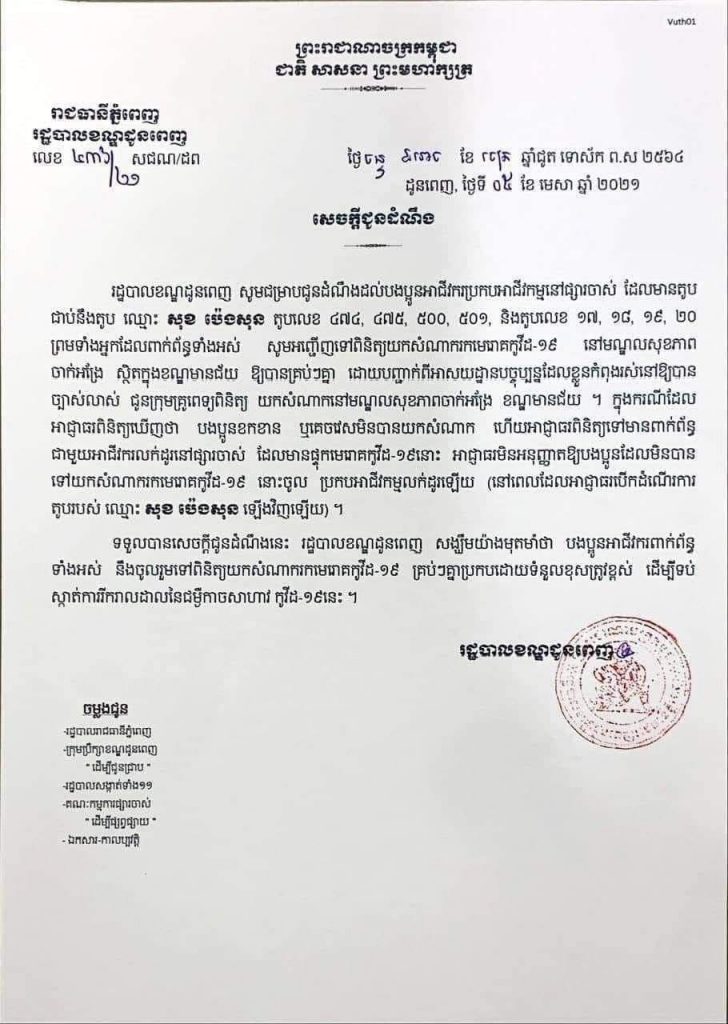 រដ្ឋបាលខណ្ឌដូនពេញ សូមជម្រាបជូនដំណឹងដល់បងប្អូនអាជីវករប្រកបអាជីវកម្មនៅផ្សារចាស់ ដែលមានតូបឈ្មោះសុខ ម៉េងសុន ព្រមទាំងអ្នកដែលពាក់ព័ន្ធទាំងអស់សូមអញ្ជើញទៅពិនិត្យយកសំណាករកមេរោគកូវីដ-១៩ នៅមណ្ឌលសុខភាពចាក់អង្រែ ស្ថិតក្នុងខណ្ឌមានជ័យ ឱ្យបានគ្រប់ៗគ្នា ដោយបញ្ជាក់ ពីអាសយដ្ឋានបច្ចុប្បន្នដែលខ្លួនកំពុងរស់នៅឱ្យបាន ច្បាស់លាស់ ជូនក្រុមគ្រូពេទ្យពិនិត្យ យកសំណាកនៅមណ្ឌលសុខភាពចាក់អង្រែ ខណ្ឌមានជ័យ ។