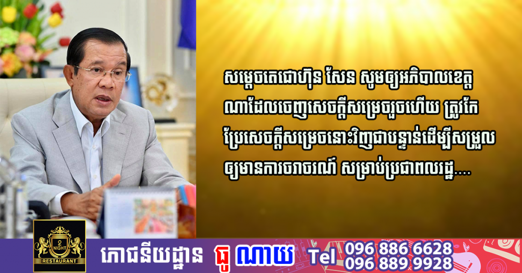 សម្តេចតេជោហ៊ុន សែន សូមឲ្យអភិបាលខេត្តណាដែលចេញសេចក្តីសម្រេចរួចហើយ ត្រូវកែ ប្រែសេចក្តីសម្រេចនោះវិញជាបន្ទាន់ ដើម្បីសម្រួលឲ្យមានការចរាចរណ៍សម្រាប់ប្រជាពលរដ្ឋ….