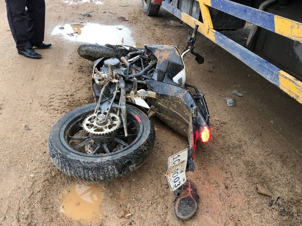 បុរសម្នាក់ជិះម៉ូតូប៉ះដៃចង្កូតរថយន្តអាបែនដឹកដីបើកបញ្ច្រាស ខ្ទាតទៅបុករថយន្តស្ទួចចតស្ងៀម