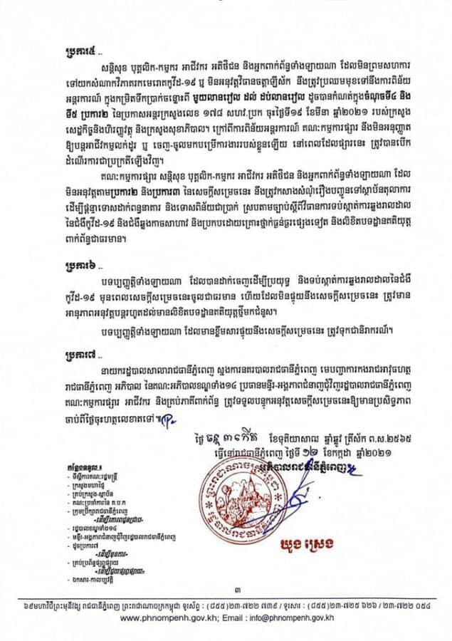 នេះបើយោងតាមសេចក្ដីសម្រេចរបស់ លោក ឃួង ស្រេង អភិបាលរាជធានីភ្នំពេញ នៅថ្ងៃទី១២ ខែកក្កដា ឆ្នាំ២០២១ នេះ ដែល CPNS NEWS ទើបទទួលបាន ៕