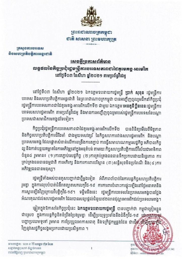 ក្រសួងការបរទេស ប្រកាសពីលទ្ធផលកិច្ចប្រជុំរដ្ឋមន្ត្រីការបរទេសភាពជាដៃគូមេគង្គ-អាមេរិក លើកទី២ ដែលធ្វើឡើងតាមប្រព័ន្ធវីដេអូ