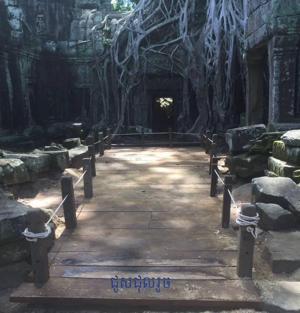 (សៀមរាប)៖ ក្រុមថែរក្សាបរិក្ខាទេសចរណ៍ នៃនាយកដ្ឋានអភិវឌ្ឍន៍ទេសចរណ៍អង្គរ បានធ្វើការងារជួសជុលកម្រាលឈើ ដែលមានសភាពពុកផុយ ដើម្បីសម្រួលដល់ភ្ញៀវទេសចរ ទស្សនាទិដ្ឋភាពដ៏អស្ចារ្យ នៃប្រាសាទតាព្រហ្ម ដែលជាកន្លែងដ៏ទាក់ទាញ ភ្ញៀវទេសចរចម្រុះជាតិសាសន៍ ទៅផ្តិតយករូបភាព បង្ហាញពីការរស់នៅរវាងដើមឈើ ជាមួយនឹងប្រាសាទដែលមានអាយុកាលរាប់រយឆ្នាំមកហើយ។