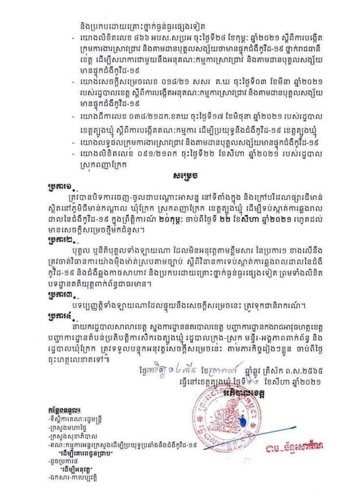 ខាងក្រោមនេះ ជាសេចក្ដីសម្រេចរបស់រដ្ឋបាលខេត្ដត្បូងឃ្មុំ៖