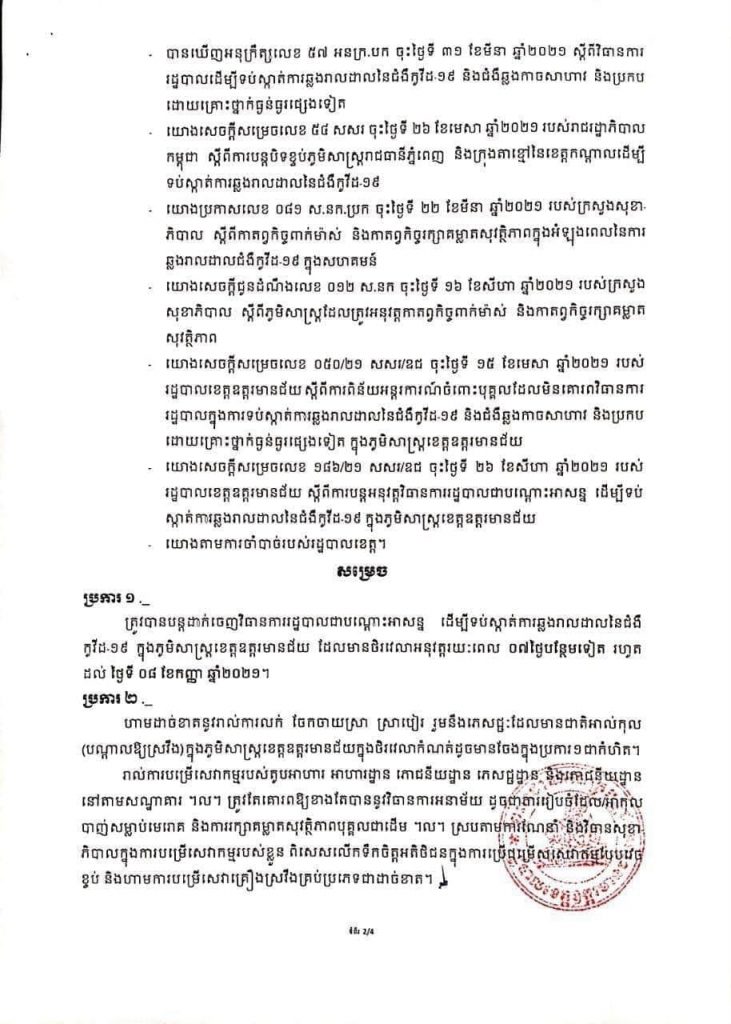 រដ្ឋបាលខេត្តឧត្តរមានជ័យ បានឱ្យដឹងថា ហាមឃាត់ជាបណ្តោះអាសន្នការធ្វើសកម្មភាព មុខរបរ និងអាជីវកម្មក្លឹបកំសាន្តគ្រប់ប្រភេទ ជាអាទិ៍ ខារ៉ាអូខេ, រង្គសាល, ឌីស្កូតែក និងបៀហ្គាឌិន, រមណីយដ្ឋាន និងសួនកំសាន្តនានា, អាជីវកម្មម៉ាស្សា ហាងលក់ និងសេពគ្រឿងស្រវឹងគ្រប់ប្រភេទ, រោងសម្តែងសិល្បៈ, ក្លឹបហាត់ប្រាណ និងមណ្ឌលកីឡានានា និងសកម្មភាពមុខរបរអាជីវកម្មដែលនឹងបង្កឱ្យមានស្ថានភាពប្រឈមដែលកំណត់របស់អាជ្ញាធរអនុលោមតាមតម្រូវការចាំបាច់ក្នុងការប្រយុទ្ធ និងទប់ស្កាត់ការឆ្លងរាលដាលនៃជំងឺកូវីដ១៩។