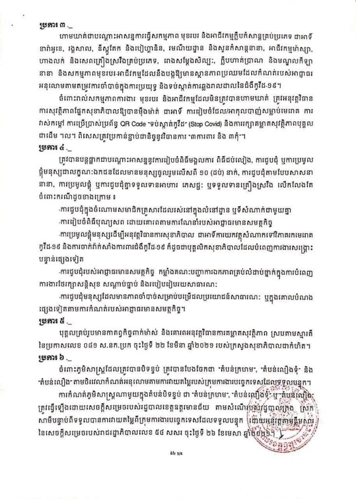 បន្ថែមពីនេះ ចំពោះរាល់សកម្មភាពការងារ មុខរបរ និងអាជីវកម្មដែលមិនត្រូវបានហាមឃាត់ ត្រូវអនុវត្តវិធានការសុវត្ថិភាពផ្នែកសុខាភិបាលឱ្យបានម៉ឺងម៉ាត់ ជាអាទិ៍ ការរៀបចំដែល/អាកុលបាញ់សម្លាប់មេរោគ ការវាស់កម្តៅ ការប្រើប្រាស់ប្រព័ន្ធ QR Code «ទប់ស្កាត់កូវីដ» (Stop Covid) និងការរក្សាគម្លាតសុវត្ថិភាពបុគ្គលជាដើម។ល។ ពិសេសត្រូវប្រកាន់ខ្ជាប់ជានិច្ចនូវវិធានការ ( ៣ការពារ និង៣កុំ )៕