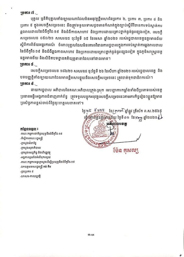 រដ្ឋបាលខេត្តឧត្តរមានជ័យ បន្តអនុវត្តវិធានការរដ្ឋបាលជាបណ្តោះអាសន្ន ១សប្តាហ៍បន្ថែមទៀត ដើម្បីទប់ស្កាត់ជំងឺកូវីដ១៩