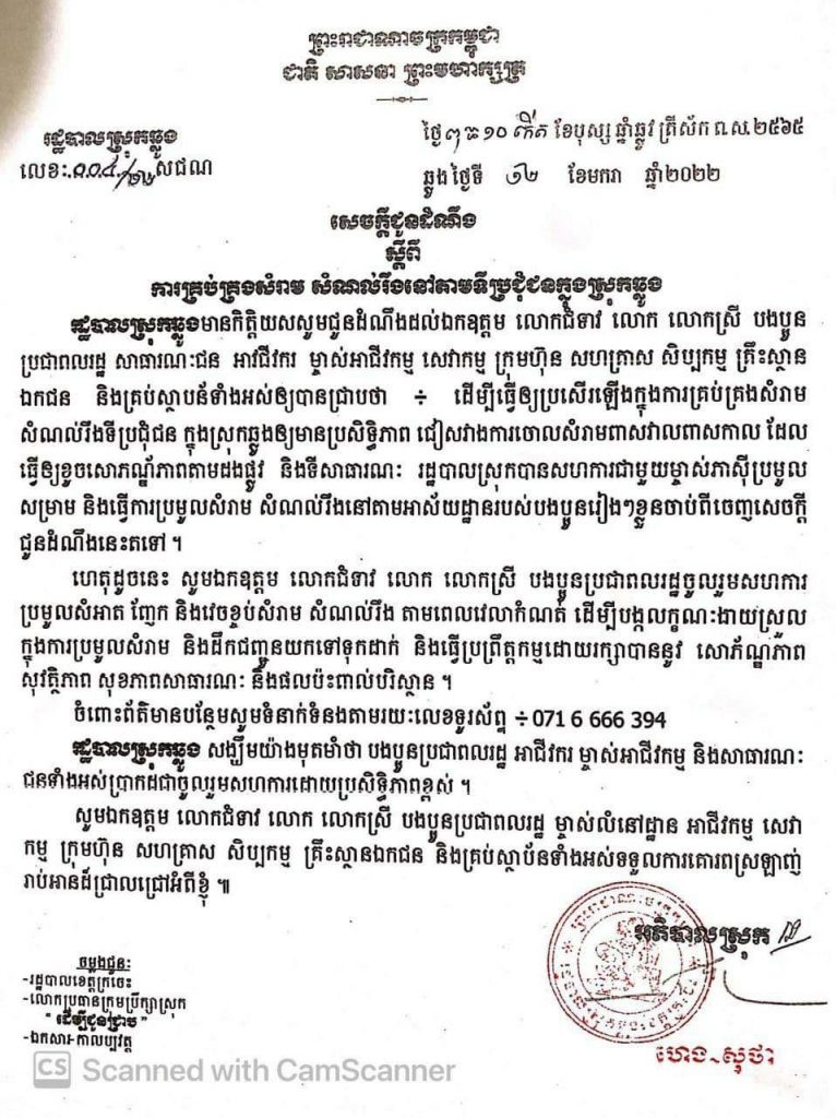(ក្រចេះ)៖ រដ្ឋបាលស្រុឆ្លូង ខេត្តក្រចេះ បានចេញសេចក្ដីជូនដំណឹងស្ដីពីការគ្រប់គ្រងសំរាម និងសំណល់រឹងក្នុងទីប្រជុំជនដល់បងប្អូនអាជីវករ ម្ចាស់អាជីវកម្ម ក្រុមហ៊ុន សហគ្រាស សិប្បកម្ម សេវាកម្ម និងគ្រឹះស្ថានឯកជនគ្រប់ប្រភេ ព្រមទាំងប្រជាពលរដ្ឋទាំងអស់ ត្រូវបញ្ឃប់រាល់ការបោះចោលសំរាប់ពាសវាលពាសកាលបន្ដទៀត ខណៈពេលដែលមានការប្រគួតប្រជែងទីក្រុងស្អាតនាពេលខាងមុខនេះ។