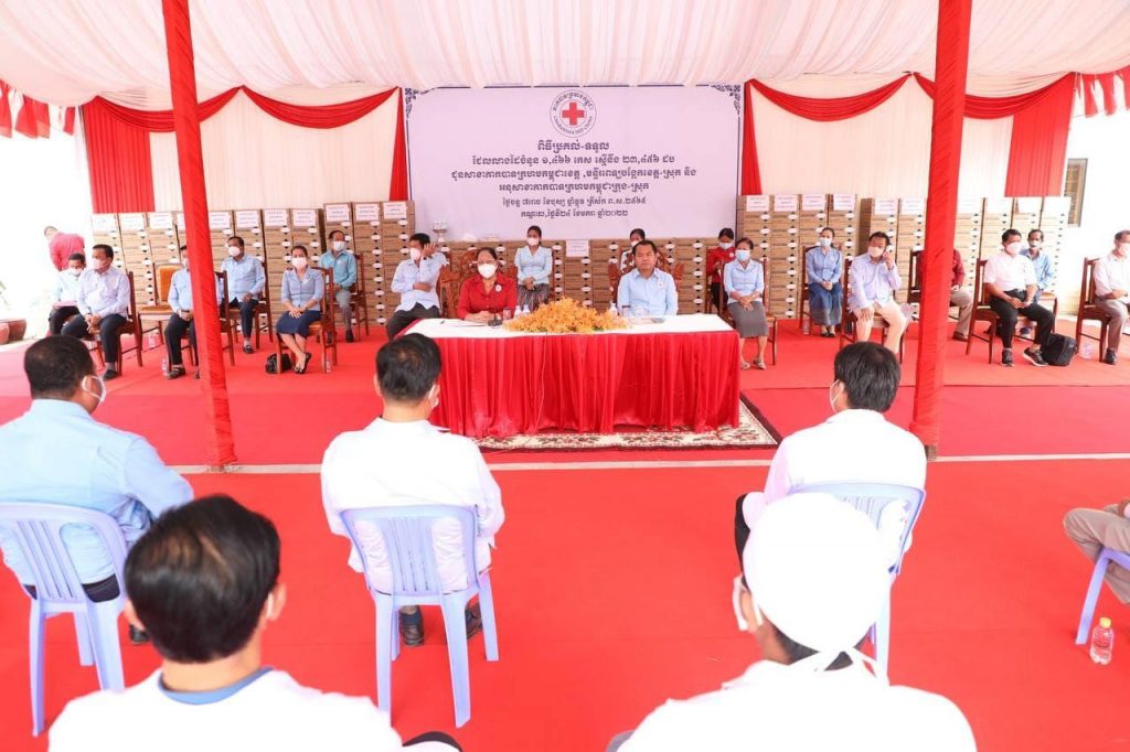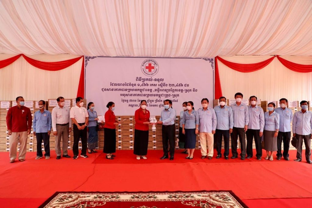 ពិធីប្រគល់-ទទួលនេះបានប្រព្រឹត្តទៅក្រោមអធិបតីភាពលោកស្រី ម៉ែន នារីសោភ័គ អគ្គលេខាធិការរងទី១ កាកបាទក្រហមកម្ពុជា និងលោក គង់ សោភ័ណ្ឌ ប្រធានគណៈកម្មាធិការសាខាកាកបាទក្រហមកម្ពុជា ខេត្តកណ្តាល។