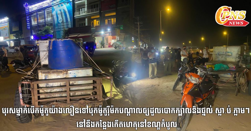 បុរសម្នាក់បើកម៉ូតូយ៉ាងលឿនទៅបុកម៉ូតូរ៉ឺម៉កបណ្ដាលឲ្យដួលបោកក្បាលនិងថ្នល់.ស្លា.ប់.ភ្លា.មៗ នៅនឹងកន្លែងកើតហេតុនៅខណ្ឌកំបូល