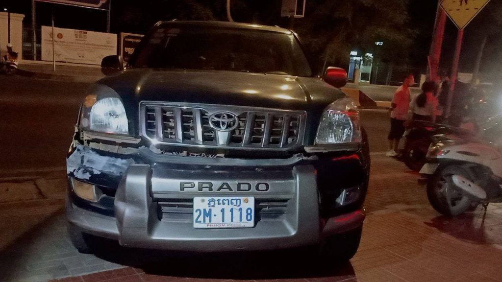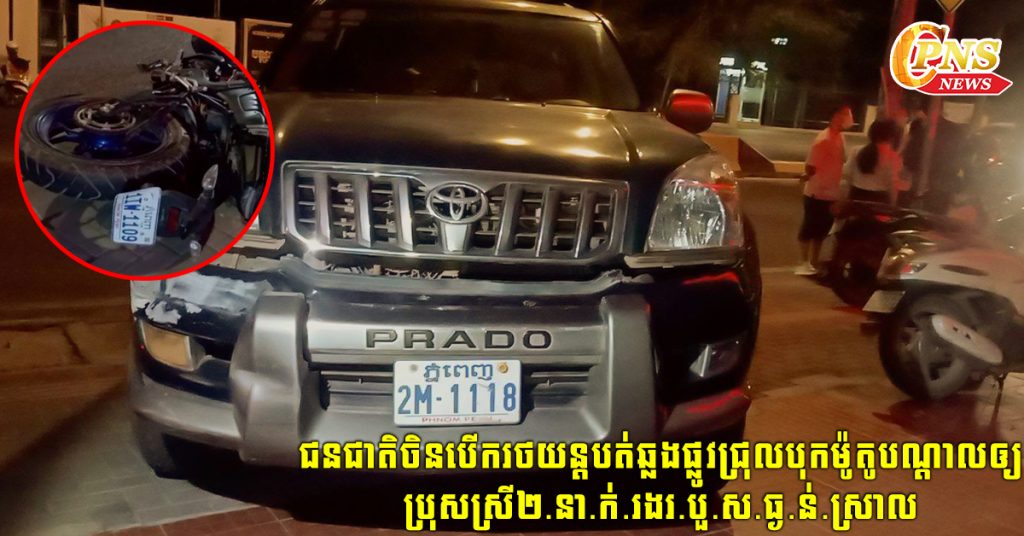 ភ្នំពេញ: បុរសជនជាតិចិនម្នាក់រួមដំណើរនឹងជនជាតិចិនប្តុសស្រី ២ នាក់ទៀតបើករថយន្តPRADO មួយគ្រឿងបត់ឆ្លងផ្លូវលឿនមិនប្រយ័ត្នជ្រុលទៅបុកម៉ូតូមួយគ្រឿងជិះដោយប្រុសស្រី២នាក់កំហឹងបណ្តាលឲ្យរងរបួសធ្ងន់ស្រាល។