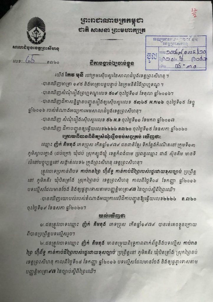 ពេលនេះតុលាការខេត្តព្រះសីហនុ ចេញដីកាបង្កាប់ឲ្យចាប់ខ្លួនលោក ញ៉ក់ គឹមតុង សង្ស័យជាមេខ្លោង ពាក់ព័ន្ធនិងការបង្ករភាពអនាធិបតេយ្យ លើដីតំបន់ហាមឃាត់ពយម៉ាចូវ