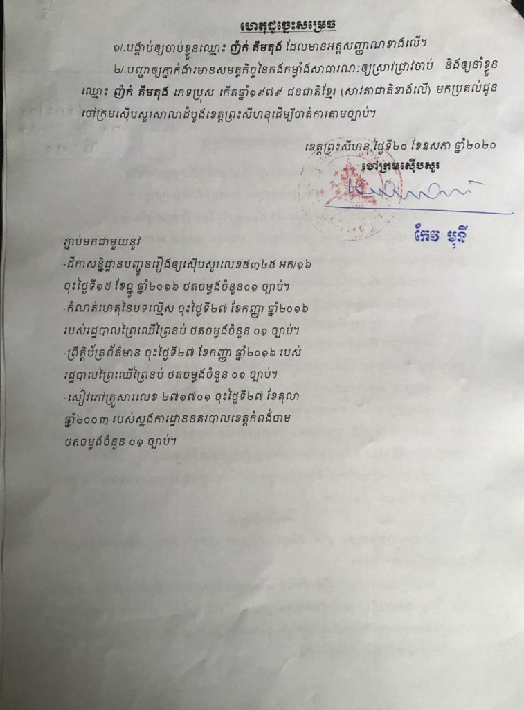 ក្រោមការចង្អុលបង្ហាញពីសំណាក់ឯកឧត្តមគួច ចំរើន អភិបាលនៃគណៈអភិបាលខេត្តព្រះសីហនុបាន បញ្ជាក់ថាច្បាប់គឺជាច្បាប់ មិនអាចលើកលែងបាន និងបន្តអនុវត្តន៍ទៀត ខណៈមានសេចក្តីរាយការ ថាជននេះបាន ដឹកនាំប្រមួលផ្តុំគ្នាបង្កើត បក្ខពួក ចូលទៅរំលោភបំពានលើដីតំបន់ ហាមឃាត់ ជាដីស្ថិតក្នុង ដែនគម្របព្រៃឈើ ឆ្នាំ ២០០២ ជាដីរបស់ រដ្ឋ ព្រម ទាំងបានបង្ករទំនាស់ វាយកាប់ចាក់ដណ្តើមកាន់កាប់ដី យ៉ាងអនាធិតេយ្យ រហូត មានការ ប្រើ ប្រាស់ អាវុធ ផងដែរ។
