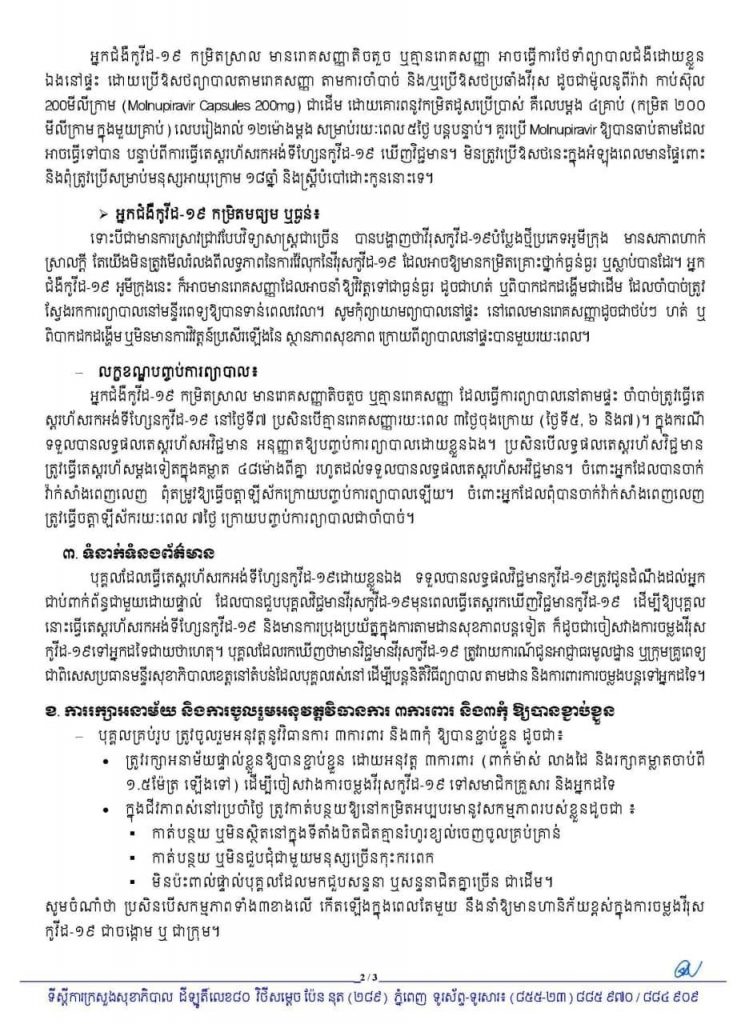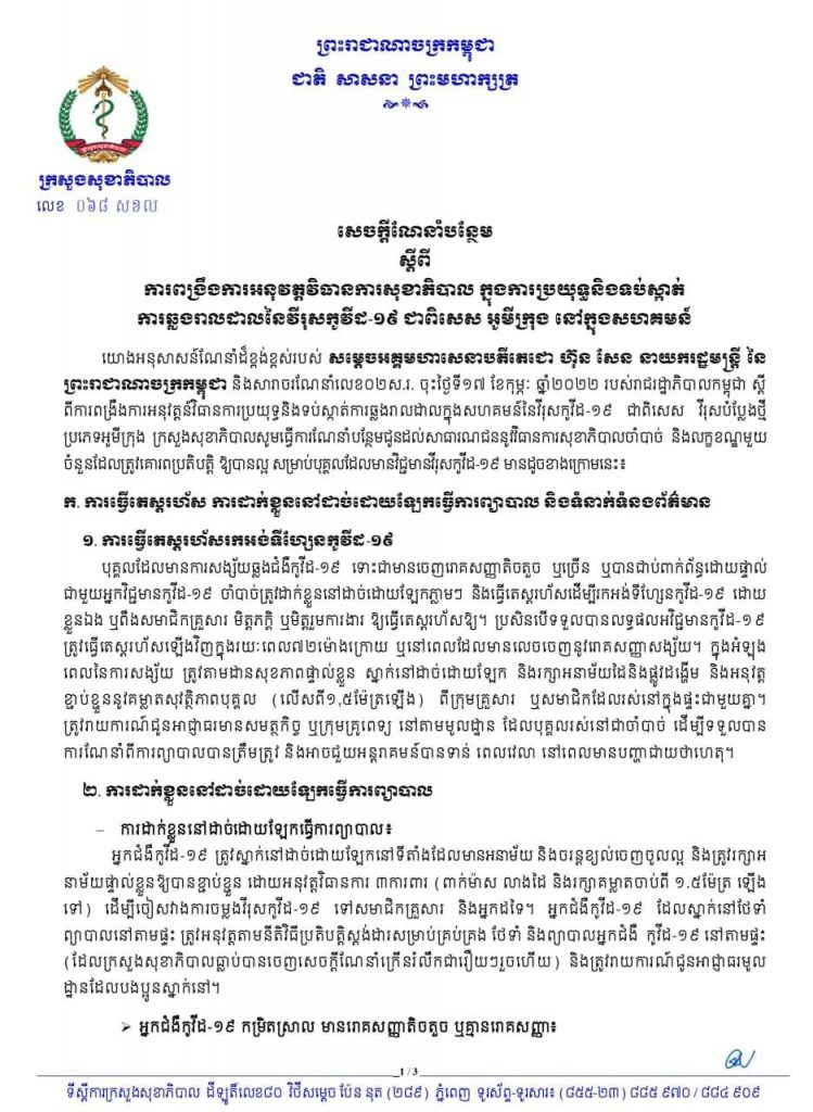 ក្រសួងសុខាភិបាលបានបញ្ជាក់ថា យោងអនុសាសន៍ណែនាំរបស់ សម្តេចតេជោ ហ៊ុន សែន នាយករដ្ឋមន្ត្រីនៃកម្ពុជា និងសារាចរណែនាំ របស់រាជរដ្ឋាភិបាលកម្ពុជា ស្តីពីការពង្រឹងការអនុវត្តន៍វិធានការប្រយុទ្ធ និងទប់ស្កាត់ការឆ្លងរាលដាល ក្នុងសហគមន៍នៃវីរុសកូវីដ-១៩ ជាពិសេស វីរុសបំប្លែងថ្មីប្រភេទអូមីក្រុង ក្រសួងសុខាភិបាលសូមធ្វើការណែនាំបន្ថែម ជូនដល់សាធារណជននូវវិធានការសុខាភិបាលចាំបាច់ និងលក្ខខណ្ឌមួយចំនួន ដែលត្រូវគោរពប្រតិបត្តិឱ្យបានល្អ សម្រាប់បុគ្គលដែលមានវិជ្ជមានវីរុសកូវីដ-១៩ មានដូចខាងក្រោមនេះ៖