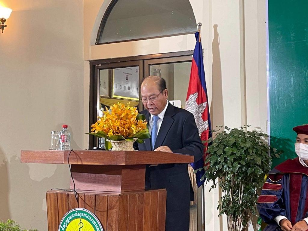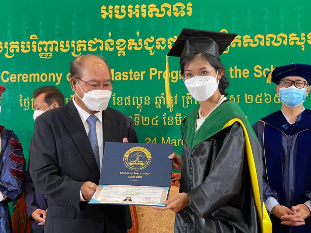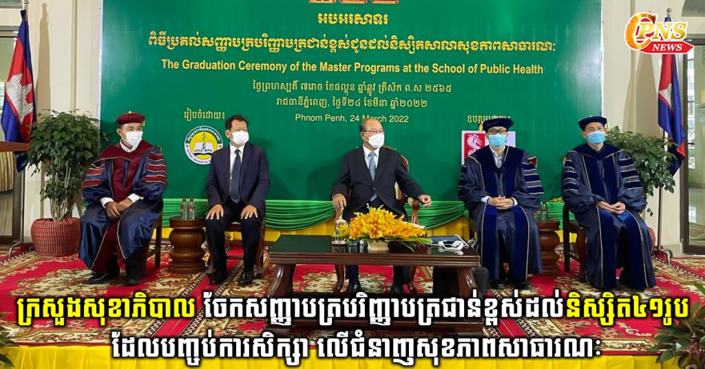 (ភ្នំពេញ)៖ លោកសាស្ត្រាចារ្យ ម៉ម ប៊ុនហេង រដ្ឋមន្ត្រីក្រសួងសុខាភិបាល នៅរសៀលថ្ងៃទី២៤ ខែមីនា ឆ្នាំ២០២២នេះ បានចែកសញ្ញាបត្របរិញ្ញាបត្រជាន់ខ្ពស់ដល់ និស្សិតចំនួន៤១រូប ដែលបានបញ្ចប់ការសិក្សា លើជំនាញសុខភាពសាធារណៈ។