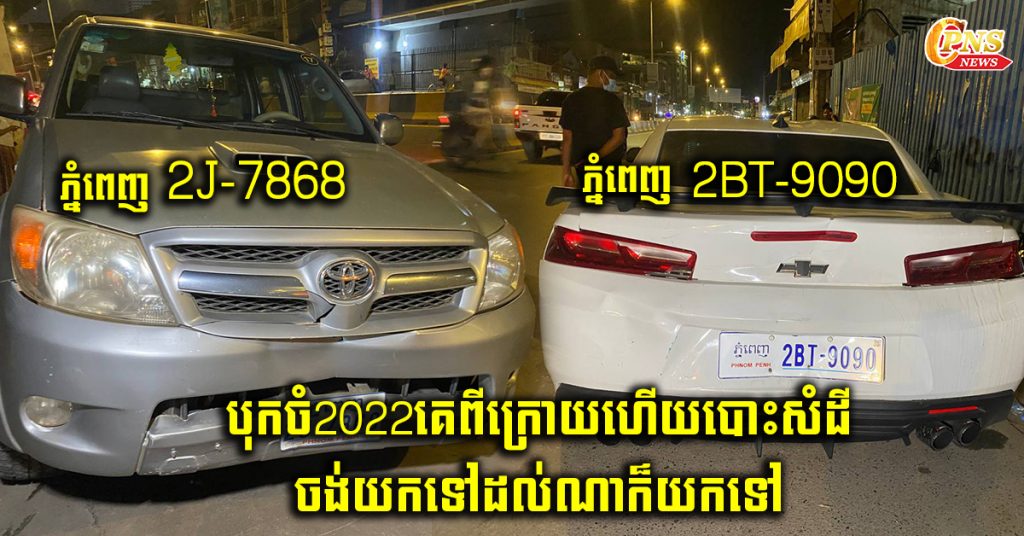 ភ្នំពេញ រថយន្ត HILux vigo មួយគ្រឿងបុកពីក្រោយរថយន្តទំនេីប Chevrolet 2022 ខូចខាតយ៉ាងដំណំបោះសំដីចង់យកទៅដល់ណាក៏យកទៅ។