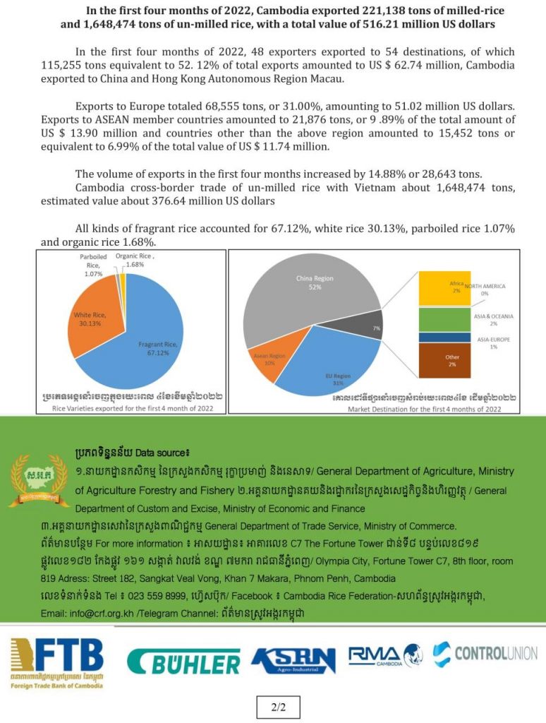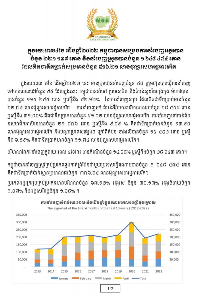 ទិន្នន័យពីសហព័ន្ធស្រូវអង្ករកម្ពុជាបានបញ្ជាក់ថា «ក្នុងរយៈពេល៤ខែ ដើមឆ្នាំ២០២២ កម្ពុជាបានសម្រេចការនាំចេញអង្ករបានចំនួន ២២១ ១៣៨ តោន កើនឡើង១៤.៨៨% និងនាំចេញស្រូវបានចំនួន ១ ៦៤៨ ៤៧៤ តោន ដែលគិតជាទឹកប្រាក់សរុបមានចំនួន ៥១៦.២១ លានដុល្លារសហរដ្ឋអាមេរិក»។