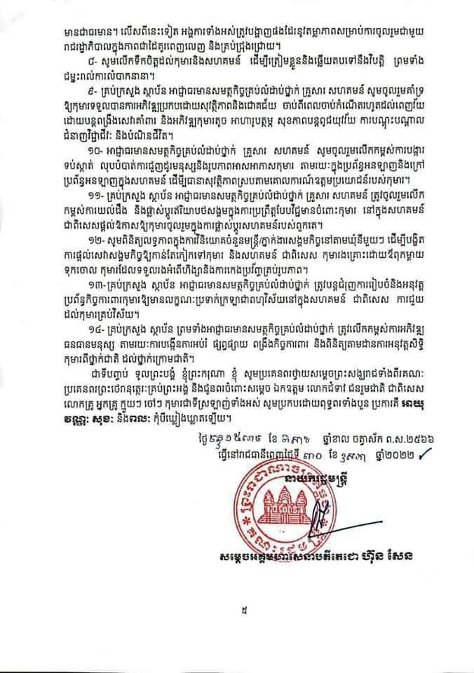 សារលិខិតសម្តេចតេជោ ហ៊ុន សែន ក្នុងឱកាសខួបលើកទី៧៣ ទិវាកុមារអន្តរជាតិ ១មិថុនា, ខួបលើកទី២១ ទិវាពិភពលោកប្រឆាំងពលកម្មកុមារ ១២ មិថុនា និងទិវាកុមារកម្ពុជា ឆ្នាំ២០២២