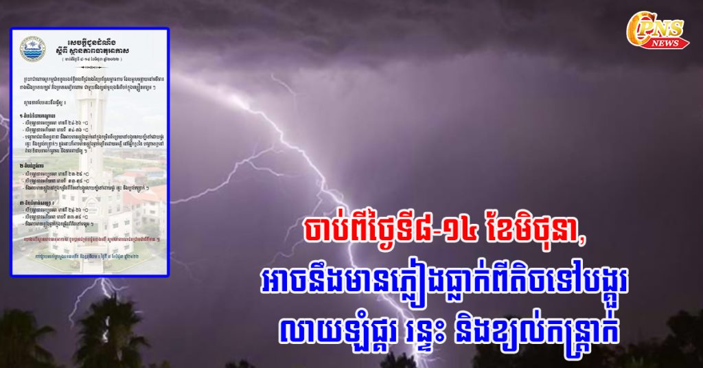 ក្រសួងធនធនទឹក ជូនដំណឹងពីស្ថានភាពធាតុអាកាស ចាប់ពីថ្ងៃទី៨-១៤ ខែមិថុនា, អាចនឹងមានភ្លៀងធ្លាក់ពីតិចទៅបង្គួរ លាយឡំផ្គរ រន្ទះ និងខ្យល់កន្ត្រាក់
