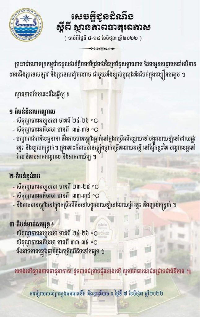 (ភ្នំពេញ)៖ ក្រសួងធនធានទឹក និងឧតុនិយម នៅថ្ងៃទី៧ ខែមិថុនា ឆ្នាំ២០២២នេះ បានចេញសេចក្តីជូនដំណឹង ស្តីពីស្ថានភាពធាតុអាកាសនៅកម្ពុជា ចាប់ពីថ្ងៃទី៨-១៤ ខែមិថុនា ឆ្នាំ២០២២។