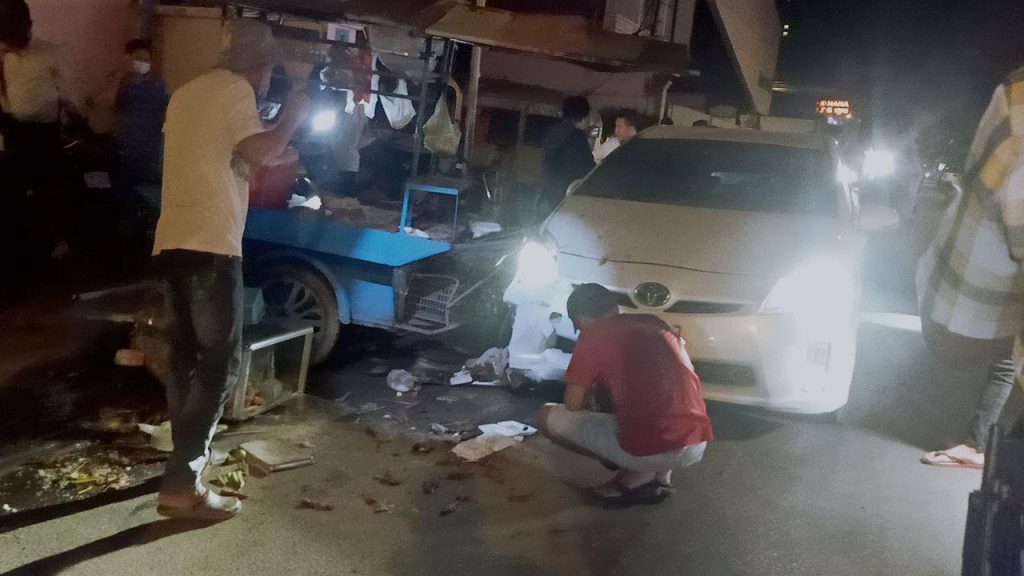 ខណ្ឌទួលគោក រាជធានីភ្នំពេញ។ តាមប្រភពព័ត៌មានពីកន្លែងកើតហេតុបានឲ្យដឹងថាមុនកើតហេតុឃើញបុរសម្នាក់បើករថយន្តtoyota prius មួយគ្រឿងពណ៌សពាក់ស្លាកលេខនគរបាល2-1295 ធ្វើដំណើរតាមបណ្តោយផ្លូវ ២៦១ ទិសដៅពីជើងទៅត្បូង លុះមកដល់ចំណុចកើតហេតុខាងលើ បានរេចង្កូតមកខាងស្ដាំដៃជ្រុលទៅបុករះម៉ូតូកង់បីឥណ្ឌាមួយគ្រឿងពណ៌សពាក់ស្លាកលេខភ្នំពេញ1GH-2881 និងរទេះលក់សាច់អាំង ខណៈកំពុងចតស្ងៀមចិញ្ចើមផ្លូវ បណ្ដាលឲ្យរងការខូចខាតយ៉ាងដំណំ និងជ្រុះសាច់អាំងរាយពេញផ្លូវ។ភ្លាមនោះគេឃើញអ្នកបើកបរចេញពីរថយន្តដើរទ្រេតទ្រោតសង្ស័យស្រវឹងស្រា។ ក្រោយកើតហេតុគេឃើញមានអាជ្ញាធរមូលដ្ឋានបានចុះមកដល់កន្លែងកើតហេតុ បានឲ្យភាគីទាំងពីរធ្វើការសម្របសម្រួលគ្នាក្រោយពីសម្របសម្រួលគ្នាអស់រយៈពេលជិតកន្លះម៉ោង ទើបខាងភាគីបង្ករបានចេញសំណងថ្លៃខូចខាតទៅឲ្យភាគីម៉ូតូកង់បីនិងភាគីរទេះលក់សាច់អាំងដើម្បីបញ្ចប់រឿងនៅកន្លែងកើតហេតុ៕