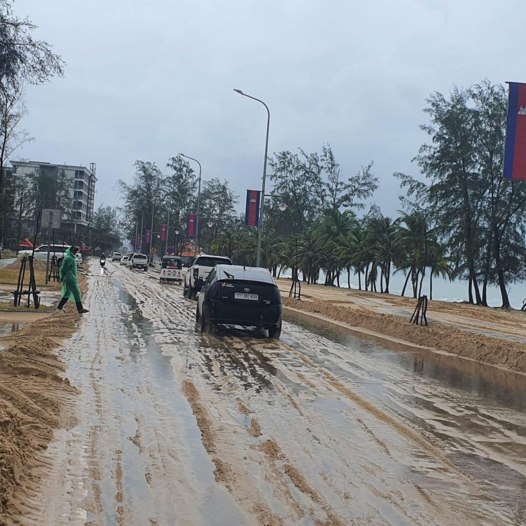 ភ្លៀង និងខ្យល់កន្ត្រាក់ គួចនាំយកខ្សាច់ជាច្រើនម៉ែត្រគូបមកគ្របដណ្តប់លើឆ្នេរលើផ្លូវ និងសួនច្បារតាមបណ្ដោយឆ្នេរអូរត្រេះ ខេត្តព្រះសីហនុ