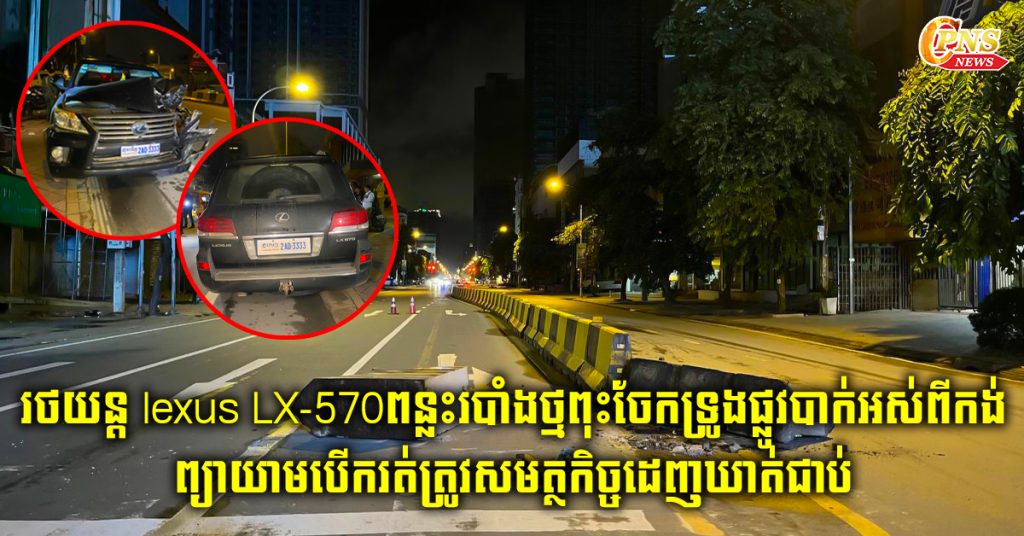 ភ្នំពេញ: បុរសវ័យចំណាស់ម្នាក់បើករថយន្តស៊េរីទំនើបlexus lx570 មួយគ្រឿងខ្វះការប្រុងប្រយ័ត្នជ្រុលទៅបុករបាំងថ្មពុះចែកទ្រូងផ្លូវបណ្ដាលឲ្យបាក់អស់ចំនួនពីកង់ កាលពីវេលាម៉ោង ១២ និង ៤០នាទីយប់រំលងអាធ្រាត្រឈានចូលថ្ងៃទី២២ ខែកក្កដា ឆ្នាំ ២០២២ នៅតាមបណ្តោយផ្លូវព្រះមុនីវង្ស កែងផ្លូវ ៣៦០ ស្ថិតក្នុងសង្កាត់បឹងកេងកងទី១ ខណ្ឌបឹងកេងកង រាជធានីភ្នំពេញ ហើយរថយន្តបង្កព្យាយាមបើករត់ចេញពីកន្លែងកើតហេតុត្រូវបានសមត្ថកិច្ចឃាត់ជាប់។ បើតាមប្រភពព័ត៌មានពីកន្លែងកើតហេតុបានដឹងថាមុនកើតហេតុឃើញបុរសវ័យចំណាស់ម្នាក់បើករថយន្ត lexus lx570 មួយគ្រឿងពណ៌ខ្មៅពាក់ស្លាកលេខភ្នំពេញ2AD-3333ធ្វើដំណើរតាមបណ្ដោយផ្លូវព្រះមុនីវង្ស ទិសដៅពីត្បូងទៅជើង លុះមកដល់ចំណុចកើតហេតុខាងលើ កែងនិងផ្លូវ៣៦០ បានរេចង្កូតទៅខាងឆ្វេងដៃជ្រុលទៅបុករបាំងថ្មពុះចែកទ្រូងផ្លូវពេញទំហឹងបណ្ដាលឲ្យបាក់អស់ចំនួនពីកង់ ចំណែករថយន្តបង្កបានព្យាយាមបានបើករត់រហូតដល់ចំណុចខាងជើងស្តុបពេទ្យចិន ផ្លូវព្រះមុនីវង្ស ស្ថិតក្នុងសង្កាត់ចតុមុខ ខណ្ឌដូនពេញត្រូវបានកម្លាំងសមត្ថកិច្ចដេញគឃាត់ជាប់ រួចបានទំនាក់ទំនងទៅសមត្ថកិច្ចជំនាញភ្លាមៗខណះដែលសមត្ថកិច្ចកំពុងរងចាំជំនាញចុះមកដល់ ស្រាប់តែមានបុរសម្នាក់បើករថយន្តស៊េរីទំនើបម៉ាកឡង់គ្រីស័រ មួយគ្រឿង មកដឹកតែកុងរថយន្តបង្កចេញពីកន្លែងកើតហេតុ ទោះសមត្ថកិច្ចខំព្យាយាមរារាំងយ៉ាងណាក៏ដោយ ក្រោយមកសមត្ថកិច្ចជំនាញបានចុះមកដល់ធ្វើការវាស់វែងយករថយន្តបង្កទៅរក្សាទុករងចាំធ្វើការដោះស្រាយគ្នាតាមផ្លូវច្បាប់៕