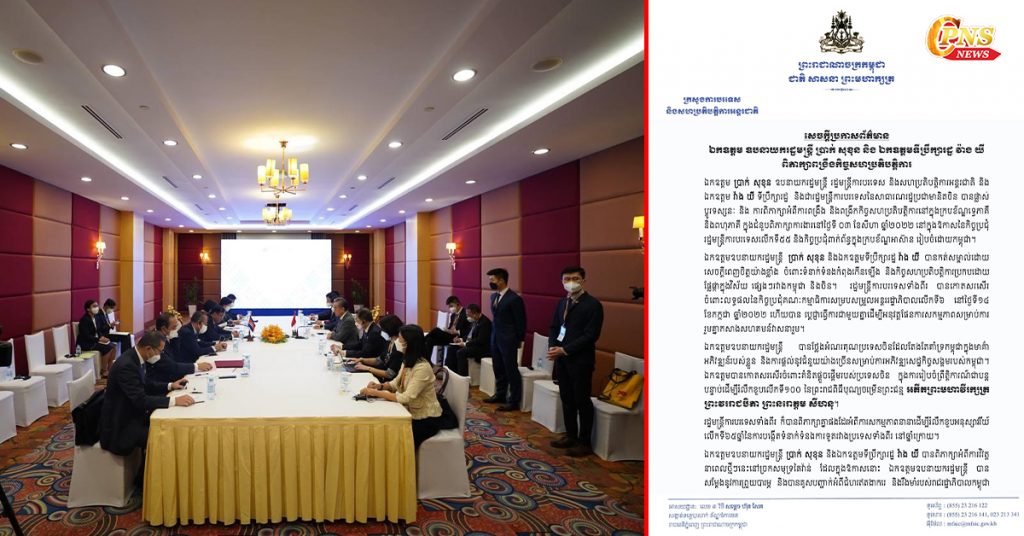 (ភ្នំពេញ)៖ ឧបនាយករដ្ឋមន្រ្តី ប្រាក់ សុខុន ឧបនាយករដ្ឋមន្រ្តី រដ្ឋមន្រ្តីការបរទេស និងសហប្រតិបត្តិការអន្តរជាតិ និងលោក វ៉ាង យី ទីប្រឹក្សារដ្ឋ និងជារដ្ឋមន្រ្តីការបរទេសនៃសាធារណរដ្ឋប្រជាមានិតចិន បានផ្លាស់ប្តូរទស្សនៈ និងការពិភាក្សាអំពីការពង្រឹង និងពង្រីកកិច្ចសហប្រតិបត្តិការនៅក្នុងក្របខ័ណ្ឌទ្វេភាគី និងពហុភាគី ក្នុងជំនួបពិភាក្សាការងារ នៅថ្ងៃទី០៣ ខែសីហា ឆ្នាំ២០២២ នៅក្នុងឱកាសនៃកិច្ចប្រជុំរដ្ឋមន្រ្តីការបរទេសលើកទី៥៥ និងកិច្ចប្រជុំពាក់ព័ន្ធក្នុងក្របខ័ណ្ឌអាស៊ាន រៀបចំដោយកម្ពុជា។