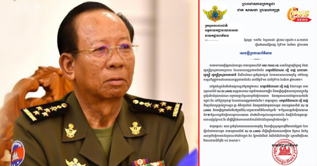 សម្ដេចពិជ័យសេនា ទៀ បាញ់ នឹងធ្វើទស្សនកិច្ចផ្លូវការនៅចិន៤ថ្ងៃ ដើម្បីបន្តពង្រឹងកិច្ចសហប្រតិបត្តិការ និងបច្ចេកទេសយោធា