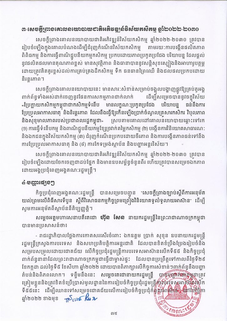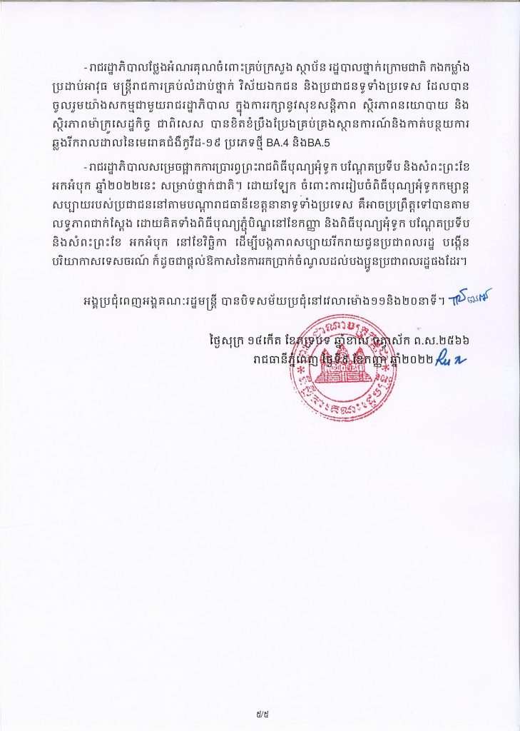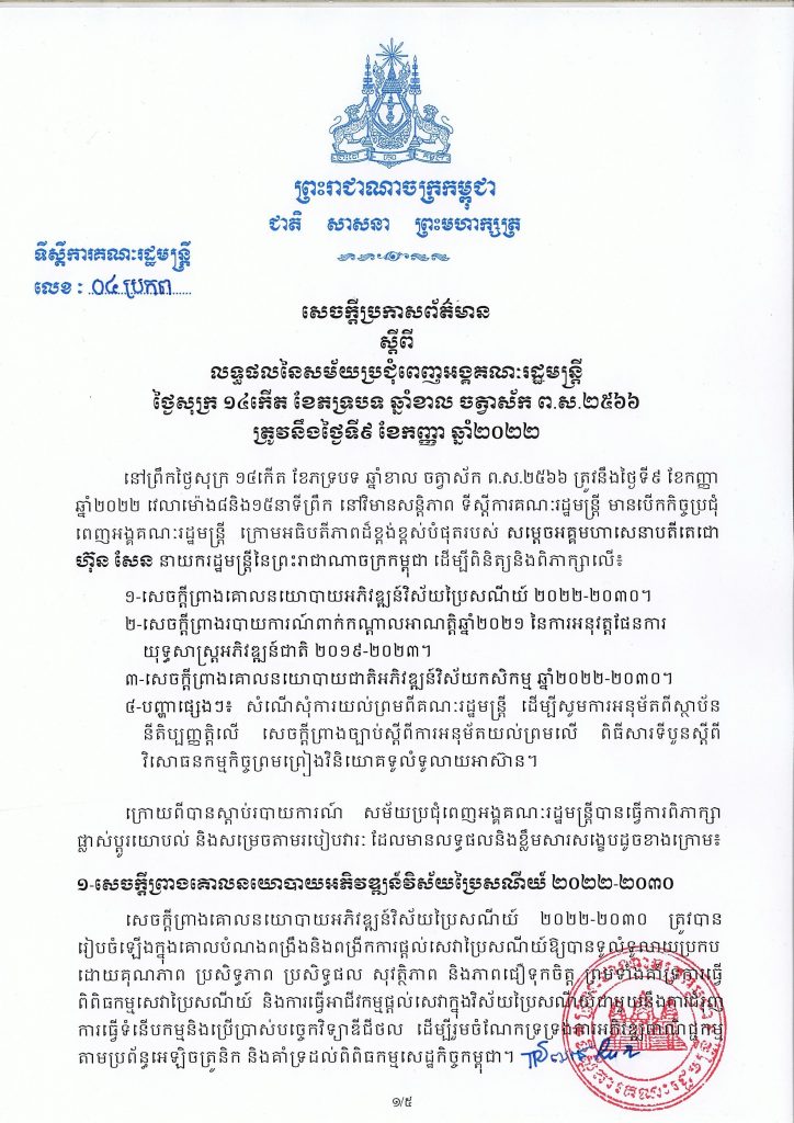ការលើកទឹកចិត្តនេះ បានធ្វើឡើងក្នុងកិច្ចប្រជុំគណៈរដ្ឋមន្ត្រីក្រោមអធិបតីភាពសម្តេចតេជោ ហ៊ុន សែន នាយករដ្ឋមន្ត្រីកម្ពុជា នៅព្រឹកថ្ងៃសុក្រ ទី០៩ ខែកញ្ញា ឆ្នាំ២០២២នេះ។