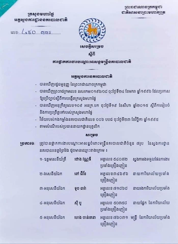 ពាក់ព័ន្ធនឹងការសម្រេចដាក់វិន័យចំពោះមន្ត្រីនគរបាលជាតិ នៃស្នងការដ្ឋាននគរបាលខេត្តព្រៃវែង ដោយសារតែមន្ត្រីទាំង០៧នាក់នោះ បានធ្វើប្រតិបត្តិការបង្ក្រាបគ្រឿងញៀនផ្ទុយពីក្រមសីលធម៌វិជ្ជាជីវ: និងវិន័យរបស់កងកម្លាំងនគរបាលជាតិ និងបង្កឲ្យមានរបួសស្នាមដល់ជនសង្ស័យ។