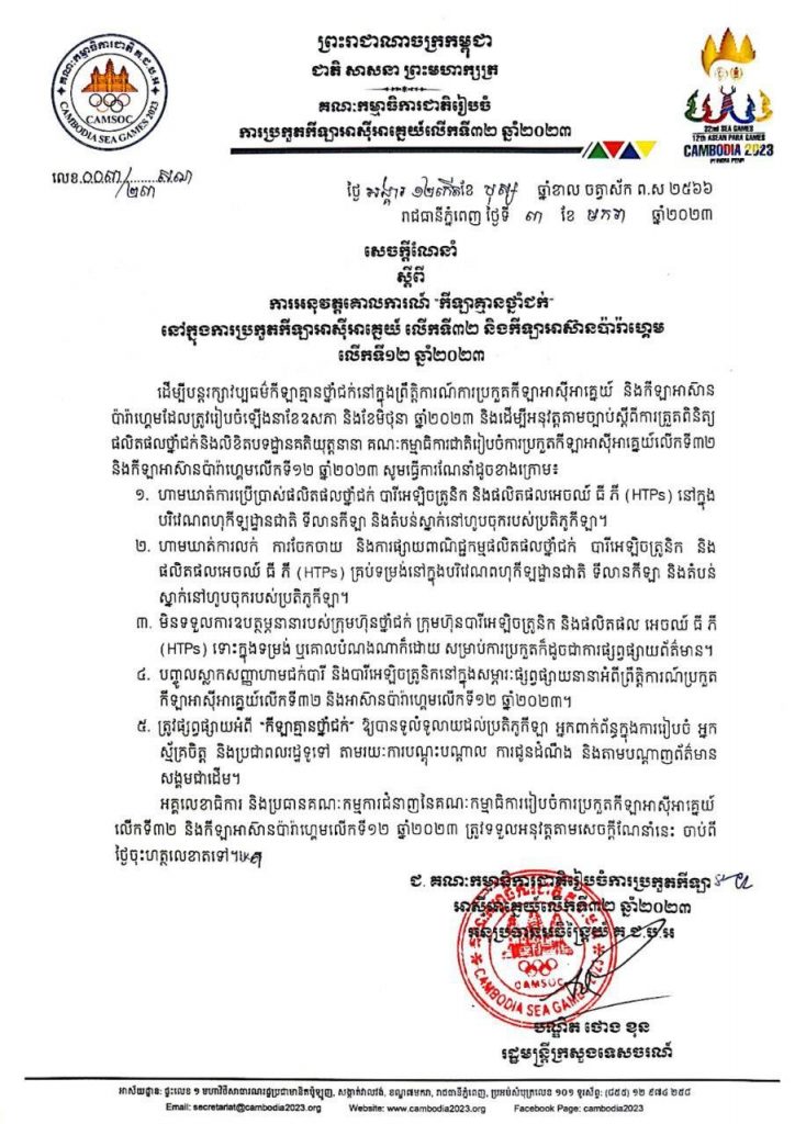 (ភ្នំពេញ)៖ គណៈកម្មាធិការជាតិរៀបចំការប្រកួតកីឡាអាស៊ីអាគ្នេយ៍លើកទី៣២ និងកីឡាអាស៊ានប៉ារ៉ាហ្គេមលើកទី១២ បានចេញសេចក្តីណែនាំកាលពីថ្ងៃទី០៣ ខែមករា ឆ្នាំ២០២៣ ហាមការជក់ផលិតផលថ្នាំជក់គ្រប់ប្រភេទ រួមទាំងបារីអេឡិចត្រូនិកនៅក្នុងព្រឹត្តិការណ៍ទាំងមូលនៃការប្រកួតកីឡាអាស៊ីអាគ្នេយ៍លើកទី៣២ និងកីឡាអាស៊ានប៉ារ៉ាហ្គេមលើកទី១២ ឆ្នាំ២០២៣។