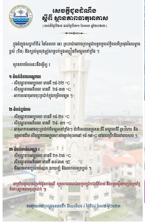 ក្រសួងធនធានទឹក ជូនដំណឹងពីស្ថានភាពធាតុអាកាស ពីថ្ងៃទី២៥-៣១ ខែមករា, អាកាសធាតអាចចុះត្រជាក់ពីកម្រិតមធ្យមទៅខ្លាំង សូមថែរក្សាសុខភាព…