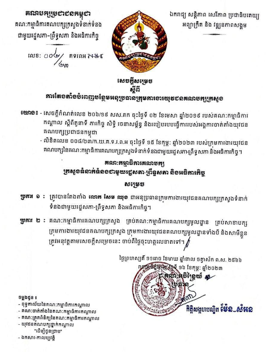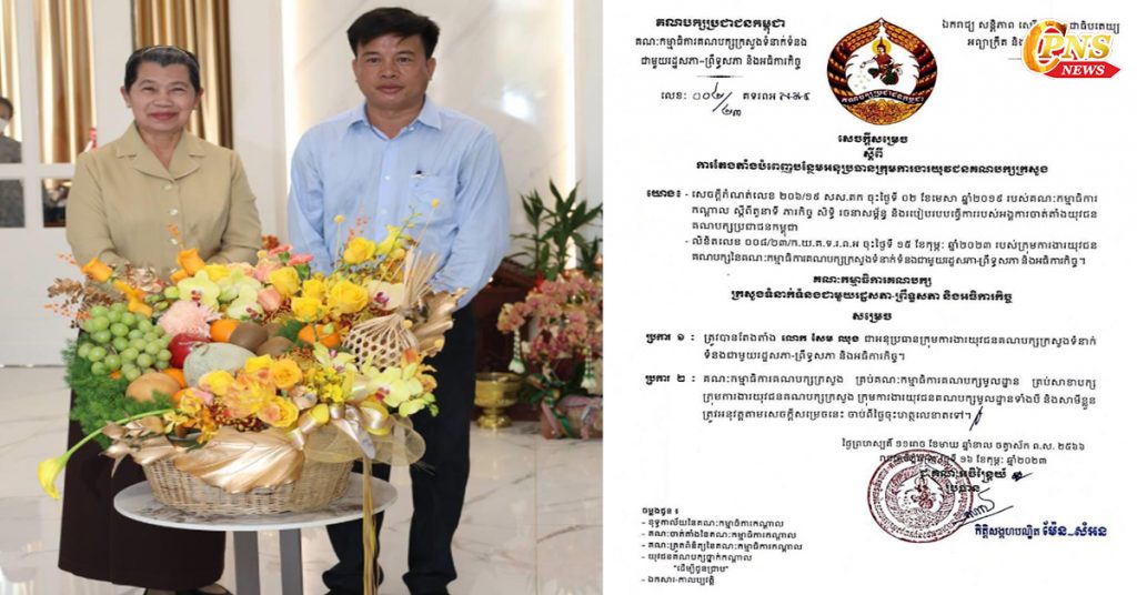 លោកស្រីបណ្ឌិត ម៉ែន សំអន តែងតាំងលោក សែម ឈុង ជាអនុប្រធានក្រុមការងារយុវជនគណបក្សប្រជាជនក្រសួងទំនាក់ទំនងរដ្ឋសភា-ព្រឹទ្ធសភា និងអធិការកិច្ច…