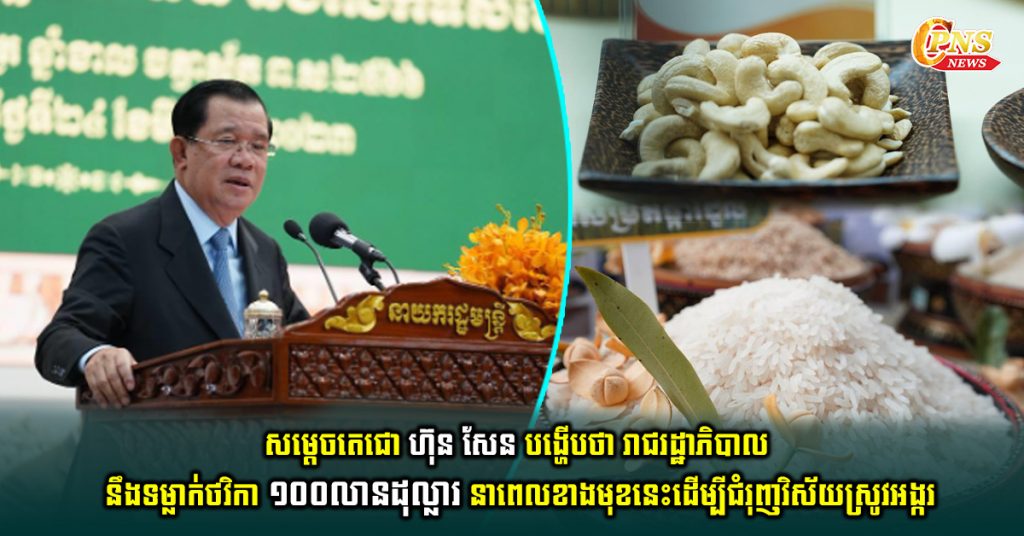 (ភ្នំពេញ)៖ សម្តេចតេជោ ហ៊ុន សែន នាយករដ្ឋមន្ត្រីនៃកម្ពុជា បានបង្ហើបថា រាជរដ្ឋាភិបាល នឹងទម្លាក់ថវិកាប្រមាណ១០០លានដុល្លារ នាពេលខាងមុខនេះ ដើម្បីជំរុញផលិតភាពស្រូវអង្ករ និងទីផ្សារ។