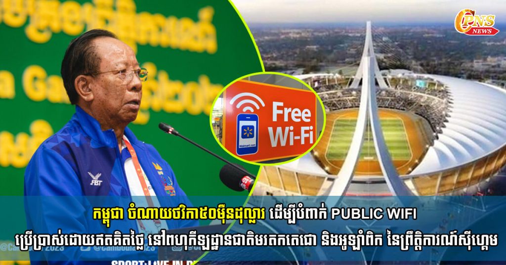 កម្ពុជា ចំណាយថវិកា៥០ម៉ឺនដុល្លារ ដើម្បីបំពាក់ Public WiFi ប្រើប្រាស់ដោយឥតគិតថ្លៃ នៅពហុកីឡដ្ឋានជាតិមរតកតេជោ និងអូឡាំពិក នៃព្រឹត្ដិការណ៍ស៊ីហ្គេម …