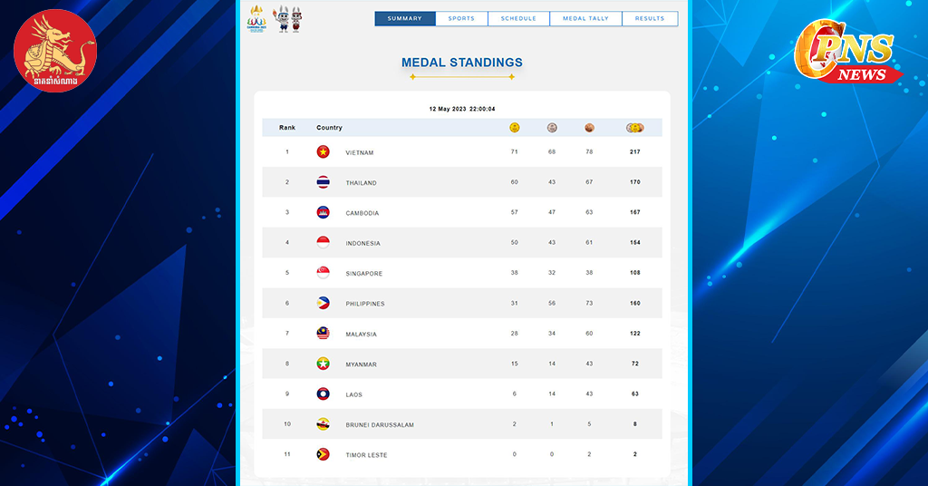 (ភ្នំពេញ)៖ យោងតាមលទ្ធផលផ្លូវការរបស់ SeaGames 2023 បង្ហាញឲ្យដឹងថា គិតត្រឹមម៉ោង១០៖០០នាទីយប់ ថ្ងៃទី១២ ខែឧសភា ឆ្នាំ២០២៣នេះ កម្ពុជាបន្តឈរលេខរៀងទី៣ បន្ទាប់ពីវៀតណាម និងថៃ ដោយមានមេដាយសរុបចំនួន ១៦៧គ្រឿង ក្នុងនោះមេដាយមាស ៥៧គ្រឿង, មេដាយប្រាក់ចំនួន ៤៧គ្រឿង និងមេដាយសំរិទ្ធចំនួន ៦៣គ្រឿង៕