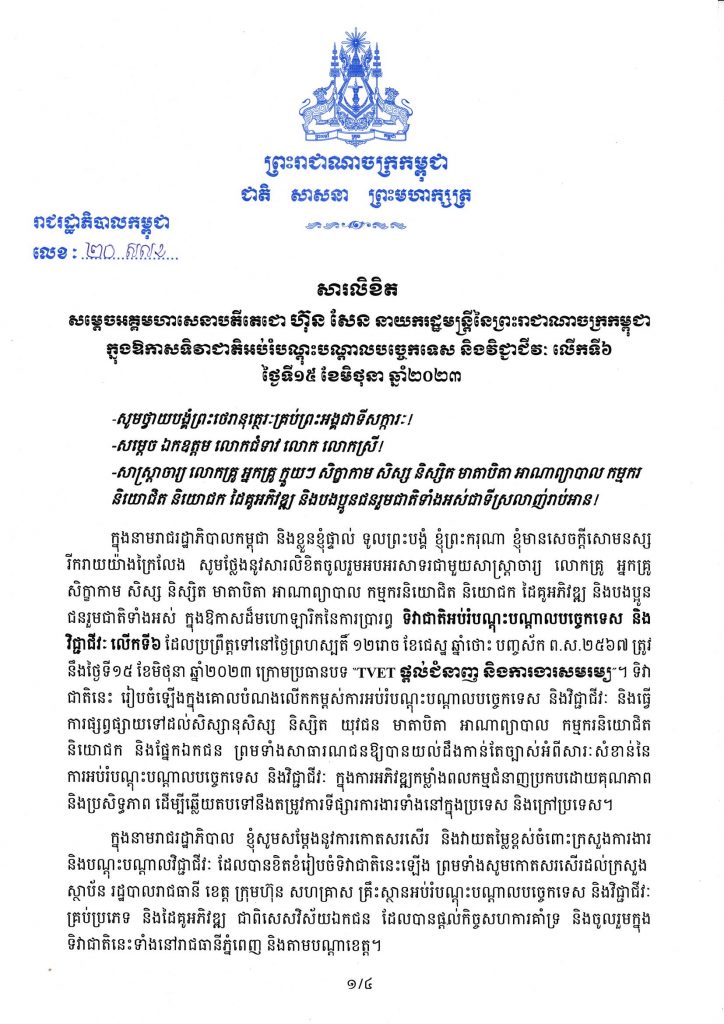 (ភ្នំពេញ)៖ សម្ដេចតេជោ ហ៊ុន សែន នាយករដ្ឋមន្ដ្រីនៃកម្ពុជា បានចេញសារលិខិត ក្នុងឱកាសទិវាជាតិអប់រំ បណ្ដុះបណ្ដាលបច្ចេកទេស និងវិជ្ជាជីវៈ លើកទី៦។ នេះបើតាមសារលិខិត ដែលបណ្ដាញព័ត៌មាន ទទួលបាននៅព្រឹកថ្ងៃទី១៥ ខែមិថុនា ឆ្នាំ២០២៣។