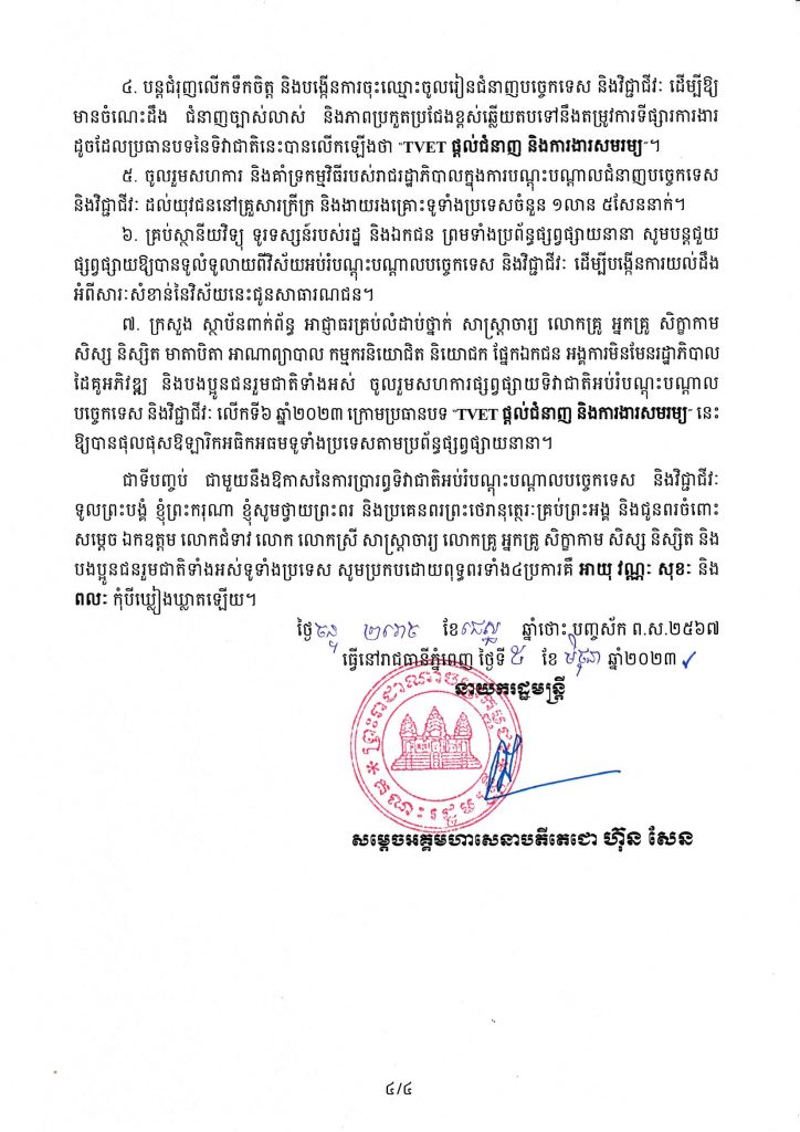សម្ដេចតេជោ ហ៊ុន សែន ចេញសារលិខិត ក្នុងឱកាសទិវាជាតិអប់រំ បណ្ដុះបណ្ដាលបច្ចេកទេស និងវិជ្ជាជីវៈ លើកទី៦ …