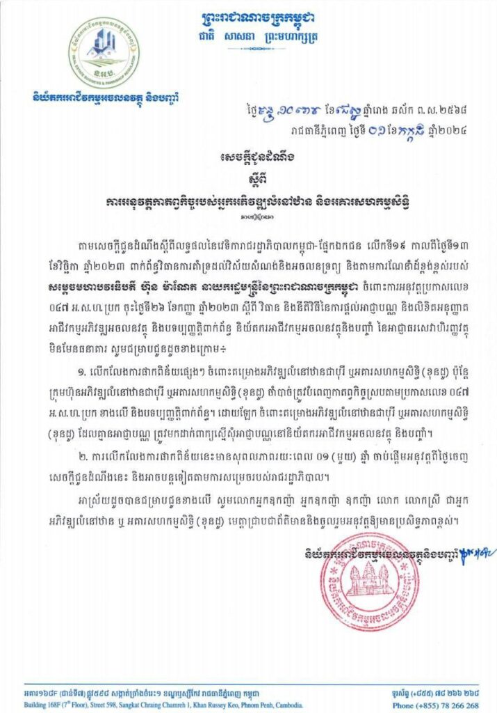 សេចក្តីជូនដំណឹង បានឲ្យដឹងថា តាមសេចក្តីជូនដំណឹងស្តីពីលទ្ធផល នៃវេទិការាជរដ្ឋាភិបាលកម្ពុជា-ផ្នែកឯកជន លើកទី១៩ កាលពីថ្ងៃទី១៣ ខែវិច្ឆិកា ឆ្នាំ២០២៣ ពាក់ព័ន្ធវិធានការគាំទ្រដល់វិស័យសំណង់ និងអចលនទ្រព្យ និងតាមការណែនាំរបស់សម្ដេចធិបតី ហ៊ុន ម៉ាណែត នាយករដ្ឋមន្ត្រីនៃកម្ពុជា ចំពោះការអនុវត្តប្រកាសលេខ ០៤៧ អ.ស.ហ.ប្រក ចុះថ្ងៃទី២៦ ខែកញ្ញា ឆ្នាំ២០២៣ ស្តីពី វិធាន និងនីតិវិធីនៃការផ្តល់អាជ្ញាបណ្ណ និងលិខិតអនុញ្ញាតអាជីវកម្មអភិវឌ្ឍអចលនវត្ថុ និងបទប្បញ្ញត្តិពាក់ព័ន្ធ និយ័តករអាជីវកម្មអចលនវត្ថុ និងបញ្ចាំ នៃអាជ្ញាធរសេវាហិរញ្ញវត្ថុ មិនមែនធនាគារ សូមជម្រាបជូនដូចខាងក្រោម៖