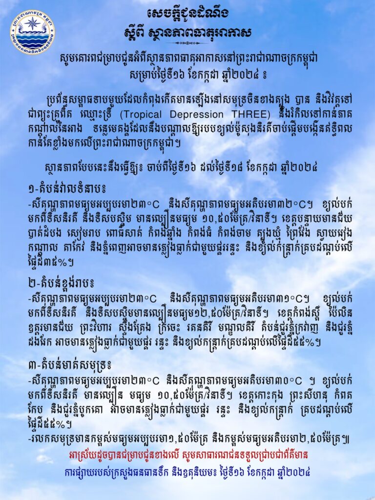 ក្រសួងបញ្ជាក់ថា ប្រព័ន្ធសម្ពាធទាបមួយដែលកំពុងកើតមានឡើងនៅសមុទ្រចិនខាងត្បូង បាន និងវិវត្តទៅជាព្យុះត្រូពិត ឈ្មោះទ្រី (Tropical Depression THREE) នឹងរំកិលទៅកាន់ភាគកណ្តាលនៃអាង ទន្លេមេគង្គដែលនឹងបណ្តាលឱ្យរបបខ្យល់ម៉ូសុងនិរតីចាប់ផ្តើមបង្កើនឥទ្ធិពលកាន់តែខ្លាំងមកលើព្រះរាជាណាចក្រកម្ពុជា។ ស្ថានភាពបែបនេះនឹងធ្វើឱ្យ៖ ចាប់ពីថ្ងៃទី១៦ ដល់ថ្ងៃទី១៨ ខែកក្កដា ឆ្នាំ២០២៤ អាកាសធាតុនៅកម្ពុជា មានលក្ខណៈដូចខាងក្រោម៖