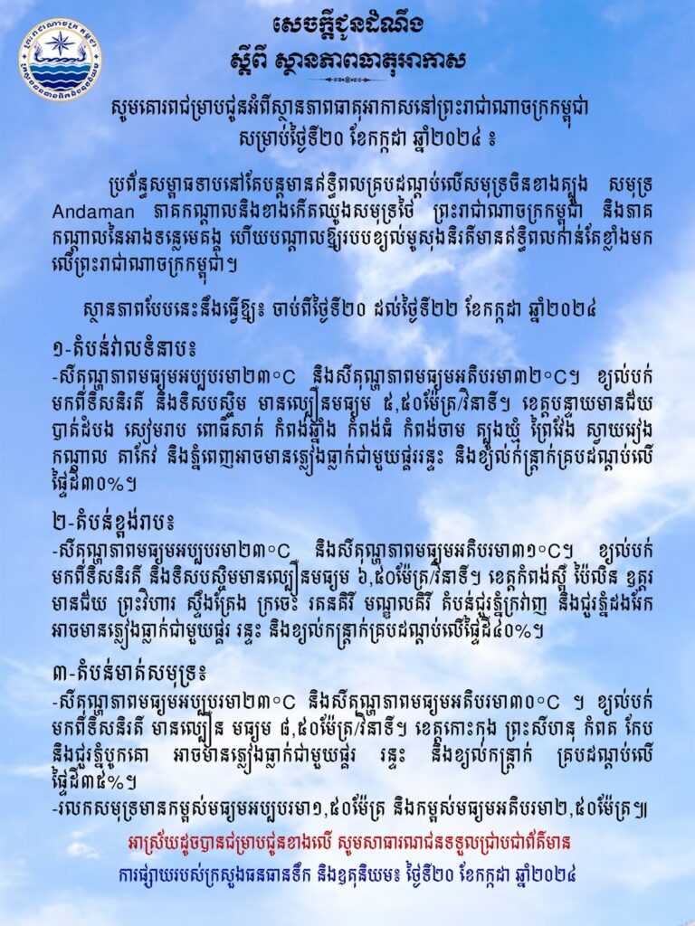 ក្រសួងបញ្ជាក់ថា ប្រព័ន្ធសម្ពាធទាបនៅតែបន្តមានឥទ្ធិពល គ្របដណ្ដប់លើសមុទ្រចិនខាងត្បូង សមុទ្រ Andaman ភាគកណ្តាលនិងខាងកើតឈូងសមុទ្រថៃ ព្រះរាជាណាចក្រកម្ពុជា និងភាគកណ្តាលនៃអាងទន្លេមេគង្គ ហើយបណ្តាលឱ្យរបបខ្យល់មូសុងនិរតីមានឥទ្ធិពល កាន់តែខ្លាំងមកលើព្រះរាជាណាចក្រកម្ពុជា។ ស្ថានភាពបែបនេះនឹងធ្វើឱ្យ៖ ចាប់ពីថ្ងៃទី២០ ដល់ថ្ងៃទី២២ ខែកក្កដា ឆ្នាំ២០២៤ អាកាសធាតុនៅកម្ពុជា មានលក្ខណៈដូចខាងក្រោម៖