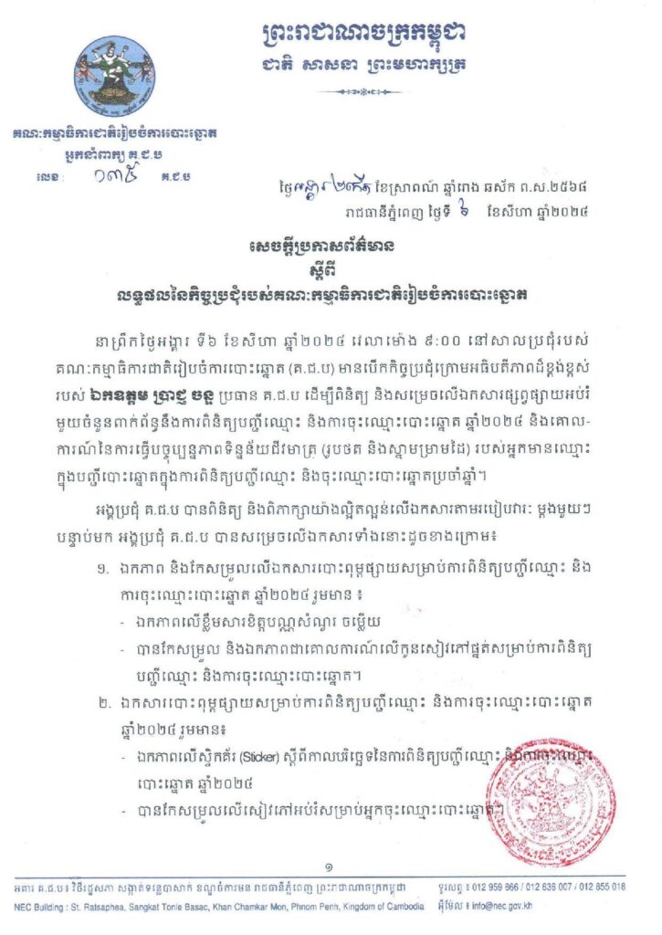 (ភ្នំពេញ)៖ គណៈកម្មាធិការជាតិរៀបចំការបោះឆ្នោត (គ.ជ.ប) មានបើកកិច្ចប្រជុំក្រោមអធិបតីភាព របស់លោក ប្រាជ្ញ ចន្ទ ប្រធាន គ.ជ.ប ដើម្បីពិនិត្យ និងសម្រេចលើឯកសារផ្សព្វផ្សាយអប់រំមួយចំនួន ពាក់ព័ន្ធនឹងការពិនិត្យបញ្ជីឈ្មោះ និងការចុះឈ្មោះបោះឆ្នោតឆ្នាំ២០២៤ និងគោល-ការណ៍នៃការធ្វើបច្ចុប្បន្នភាពទិន្នន័យជីវមាត្រ (រូបថត និងស្នាមម្រាមដៃ) របស់អ្នកមានឈ្មោះក្នុងបញ្ជីបោះឆ្នោត ក្នុងការពិនិត្យបញ្ជីឈ្មោះ និងចុះឈ្មោះបោះឆ្នោតប្រចាំឆ្នាំ។
