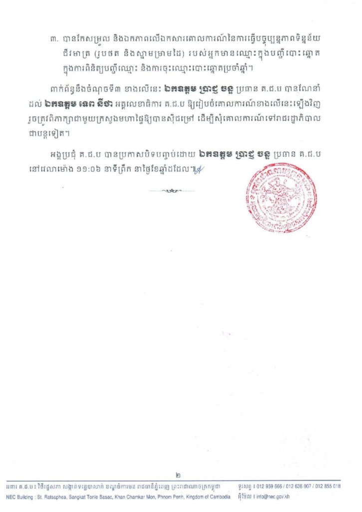 ៣៖ បានកែសម្រួល និងឯកភាពលើឯកសារគោលការណ៍នៃការធ្វើបច្ចុប្បន្នភាពទិន្នន័យជីវមាត្រ (រូបថត និងស្នាមម្រាមដៃ) របស់អ្នកមានឈ្មោះក្នុងបញ្ជីបោះឆ្នោតក្នុងការពិនិត្យបញ្ជីឈ្មោះ និងការចុះឈ្មោះបោះឆ្នោតប្រចាំឆ្នាំ។