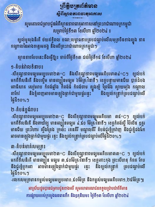ក្រសួងបញ្ជាក់ថា ខ្យល់មូសុងនិរតី ថយឥទ្ធិពល ខណៈសម្ពាធទាបគ្របដណ្ដប់លើសមុទ្រចិនខាងត្បូង ភាគកណ្តាលនៃអាងទន្លេមេគង្គ និងលើព្រះរាជាណាចក្រកម្ពុជា។ ស្ថានភាពបែបនេះនឹងធ្វើឱ្យ ចាប់ពីថ្ងៃទី១៣ ដល់ថ្ងៃទី១៥ ខែសីហា ឆ្នាំ២០២៤ អាកាសធាតុនៅកម្ពុជា មានលក្ខណៈដូចខាងក្រោម៖