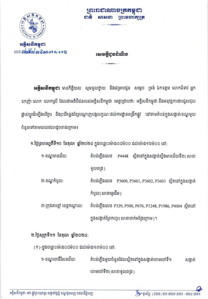 EDC ជូនដំណឹងពីការរអាក់រអួលចរន្ត តាមតំបន់មួយចំនួនចាប់ពីថ្ងៃនេះ ដល់ថ្ងៃទី១៣ ខែតុលា ដើម្បីរុះរើគន្លងខ្សែបណ្តាញ ផ្លាស់ប្តូរ តម្លើងបរិក្ខារ ងាយស្រួលដល់ការដ្ឋានពង្រីកផ្លូវ