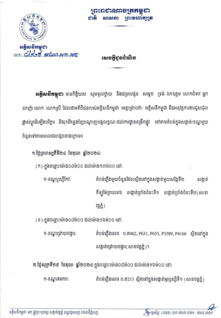 សូមអានសេចក្តីជូនដំណឹង របស់អគ្គិសនីកម្ពុជា ដូចខាងក្រោម ៖